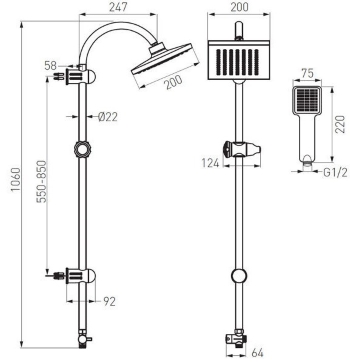 Душевая система Ferro Squerto NP22 В комплекте: верхний душ ручной душ держатель ручного душа душевая штанга душевой шланг Характеристики: ручная лейка с одним типом струи штанга металлическая передвижная 106 см диаметр верхнего душа 200 мм система FerroEasyClean душевой шланг 1500 мм в металлической оплётке конический наконечник душа шланг 70 см с гайкой 1/2" переключатель с керамической вставкой цвет: хром