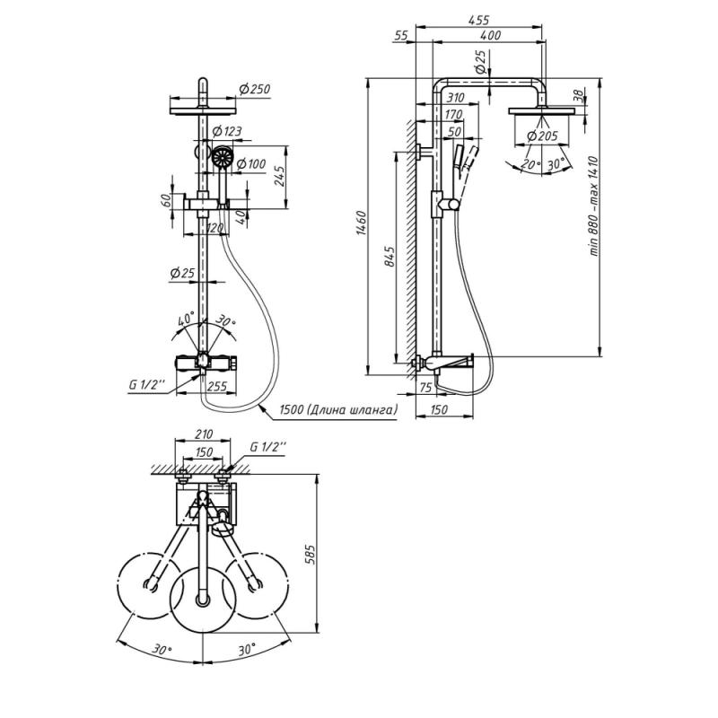 - Высота душевой стойки, мм:880-1410