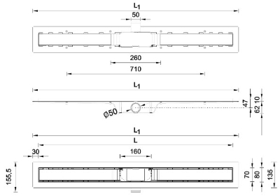 Душевой канал с решеткой под плитку 700 мм с "сухим" сифоном Длина решетки L = 700 мм Небольшая высота установки (62 мм) Съемный двойной гидрозатвор для водоотводящего желоба Высокая пропускная способность (50-60 л/мин) Выпускная труба Ø 50 мм Регулируемая высота (30 мм) Решетка из нержавеющей стали 1,5 мм Легкая очистка, долговечность Длина мм. 700 Ширина решетки мм. 70 Монтажная высота мм. от 62 до 95 Тип выпуска: Горизонтальный