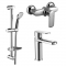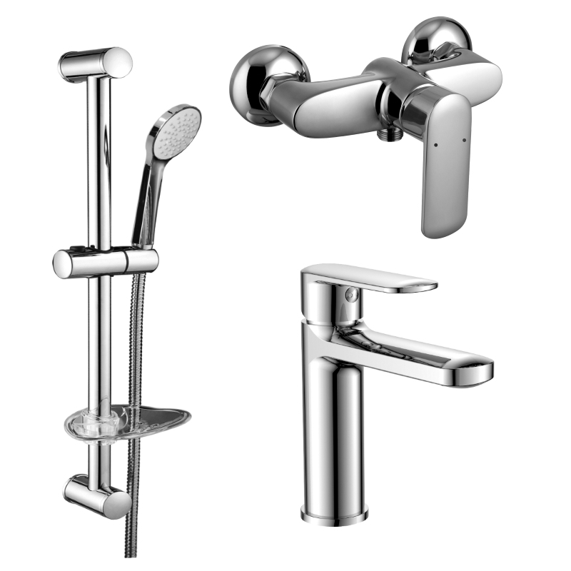 Набор смесителей для душа. В набор входят: 1. смеситель для раковины, хром; 2. смеситель для душа, хром; 3. душевой набор, хром. Диаметр лейки в душевом наборе 100 мм, режим один - ливень, двойная обплётка, мыльница прозрачная