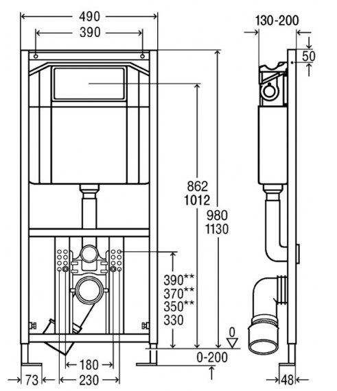 Инсталляция Viega Eco Plus 606664 Производитель: Viega В комплектацию входит: Стальная рама с порошковиым покрытием, регулируемая по высоте. Смывной бачок Visign 2H совместимый с любыми смывными клавишами Viega, с механизмом двойного смыва (полный смыв - 9 или 6 литров/малый смыв - 3 литра). Регулируемое по высоте колено DN 90. Эксцентрический переход DN 90/100. Крепеж для монтажа унитаза. Крепеж для монтажа к полу