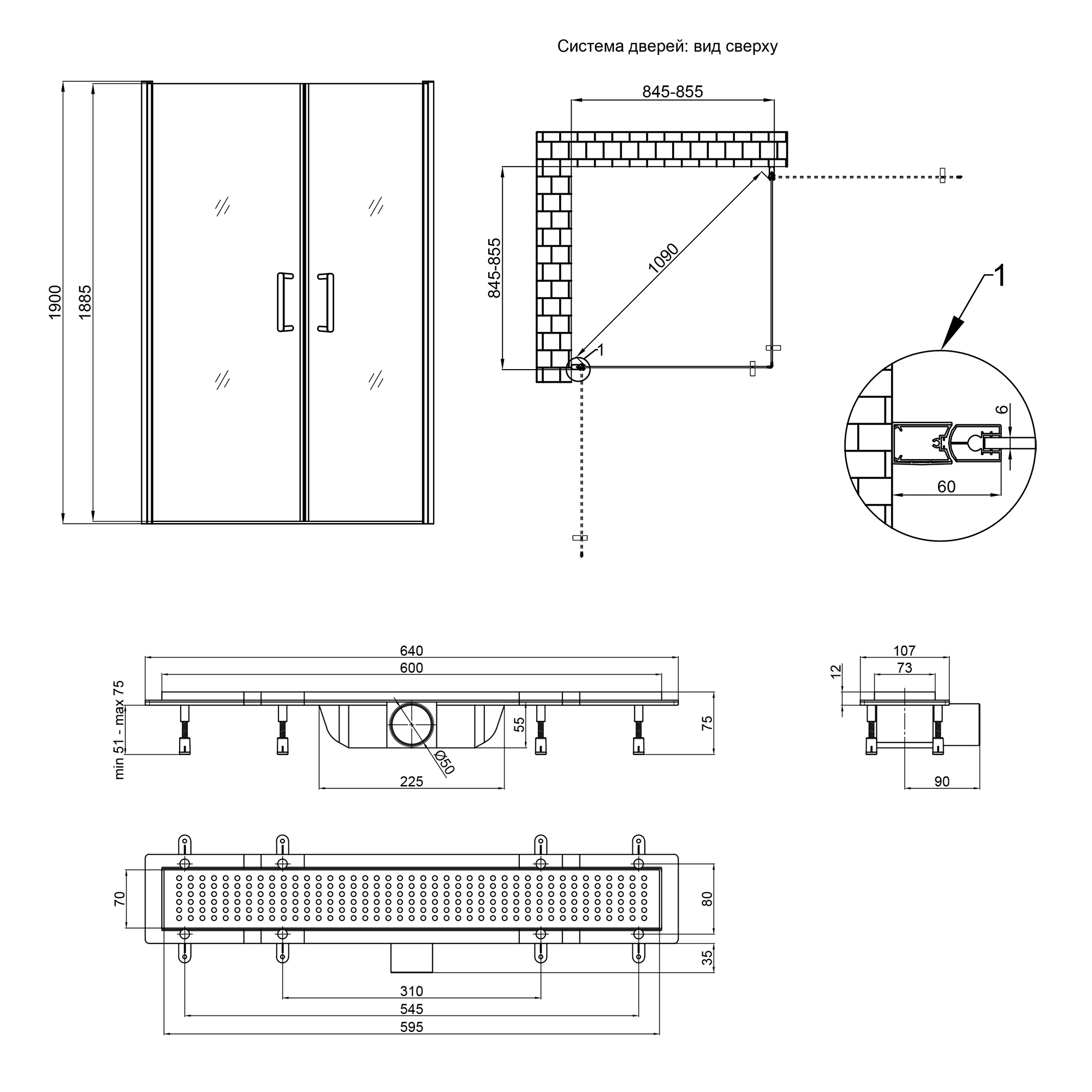 • Габариты изделия (ВхШхД), мм:Душевая кабина: 1900х845-855х845-855. Трап: 75х640х142