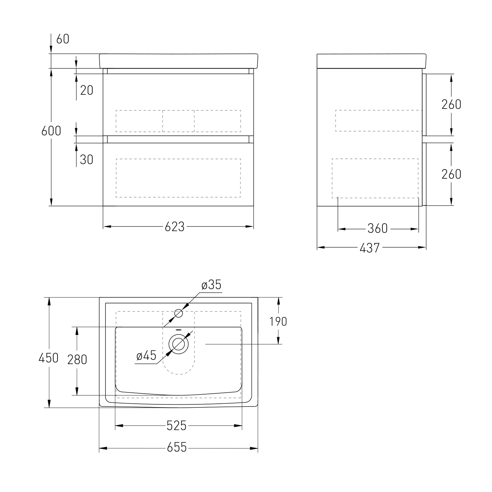Добавить отзыв о «Комплект мебели Volle OLIVA 65см белый: тумба подвесная, 2 ящика + умывальник накладной арт 13-01-065А»