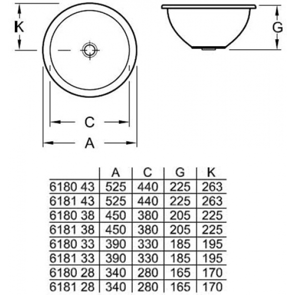 Врезная под столешницу раковина имеет круглую форму с диаметром 280 мм