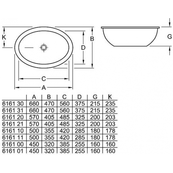 Врезная под столешницу раковина имеет овальную форму с размером 485 х 325 мм