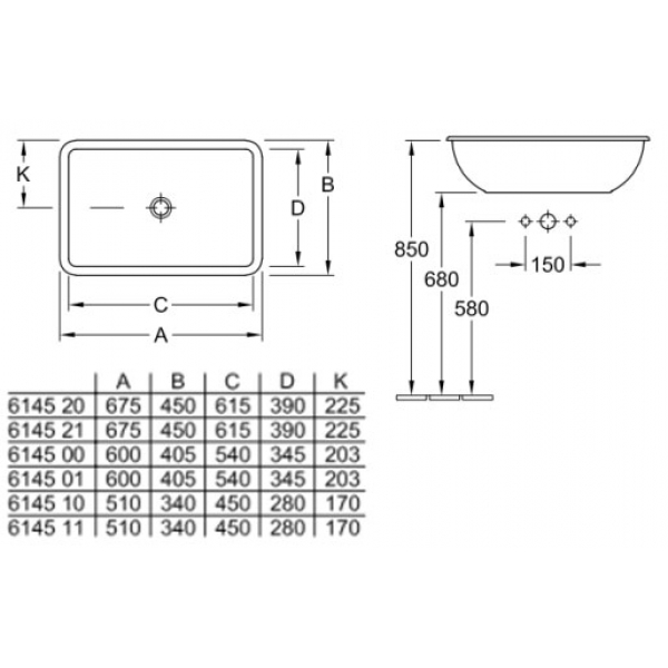 Врезная в столешницу раковина имеет прямоугольную форму с размерами 675 х 450 мм