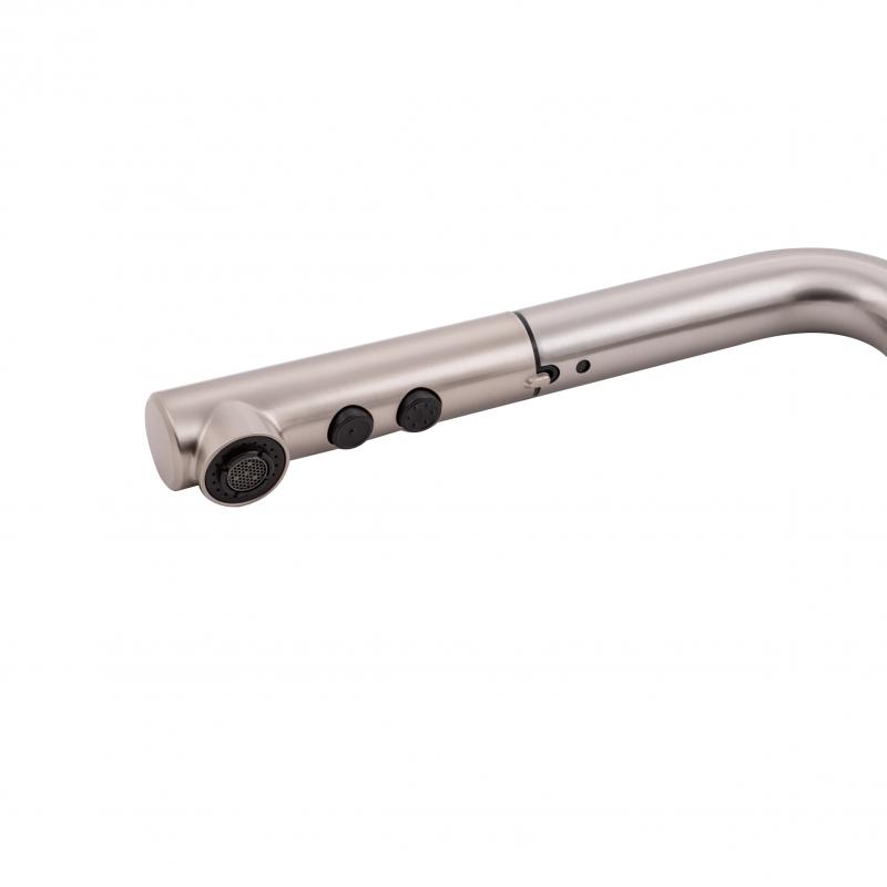 Смеситель для кухни с выдвижным изливом Qtap Janicka 9134103FN изготовлен из высококачественной латуни с брашированным никелированным покрытием, обеспечивающей долговечную бесперебойную работу изделия. Благодаря выдвижной форме излива и двум режимам подачи струи, которые переключаются кнопкой на изливе, можно с легкостью очистить труднодоступные места на посуде. Длина выдвижного шланга 1470 мм. Управление температурой и напором воды осуществляется при помощи удобного рычага.