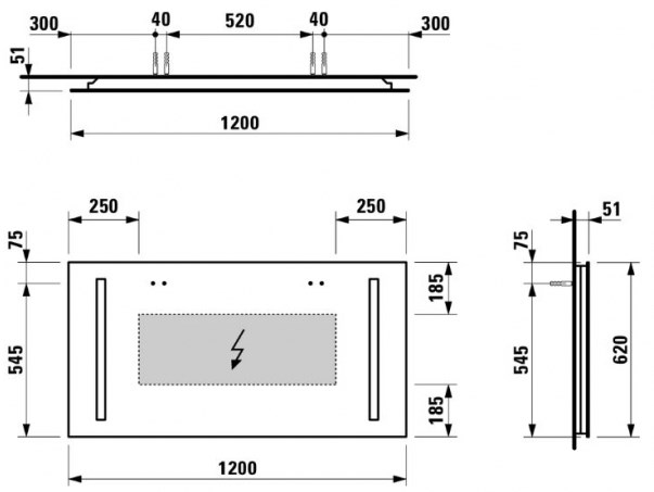 Зеркало Laufen Palace New 120 см с сенсорным выключателем H4472669961441 Форма: прямоугольная С подсветкой 2х14 Вт, IP44 Размеры (ШхВ): 1200 x 620 мм Толщина зеркала: 6 мм Вес: 13,4 кг