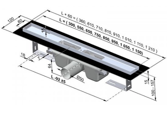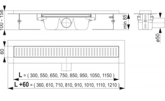 Желоб водоотводящий Alcaplast APZ1 1050 минимальная толщина бетона: 85 мм общая высота монтажа: 100-158 мм ширина ниши желоба: 60 мм сток воды желоба (CSN EN 1253): 60 л/мин. сточная труба: ø50 группа нагрузки (CSN EN 1253): K3 материал - "тело" желоба (CSN 17240): нержавеющая сталь DIN 1.4301 материал - гидрозатвор: ПП